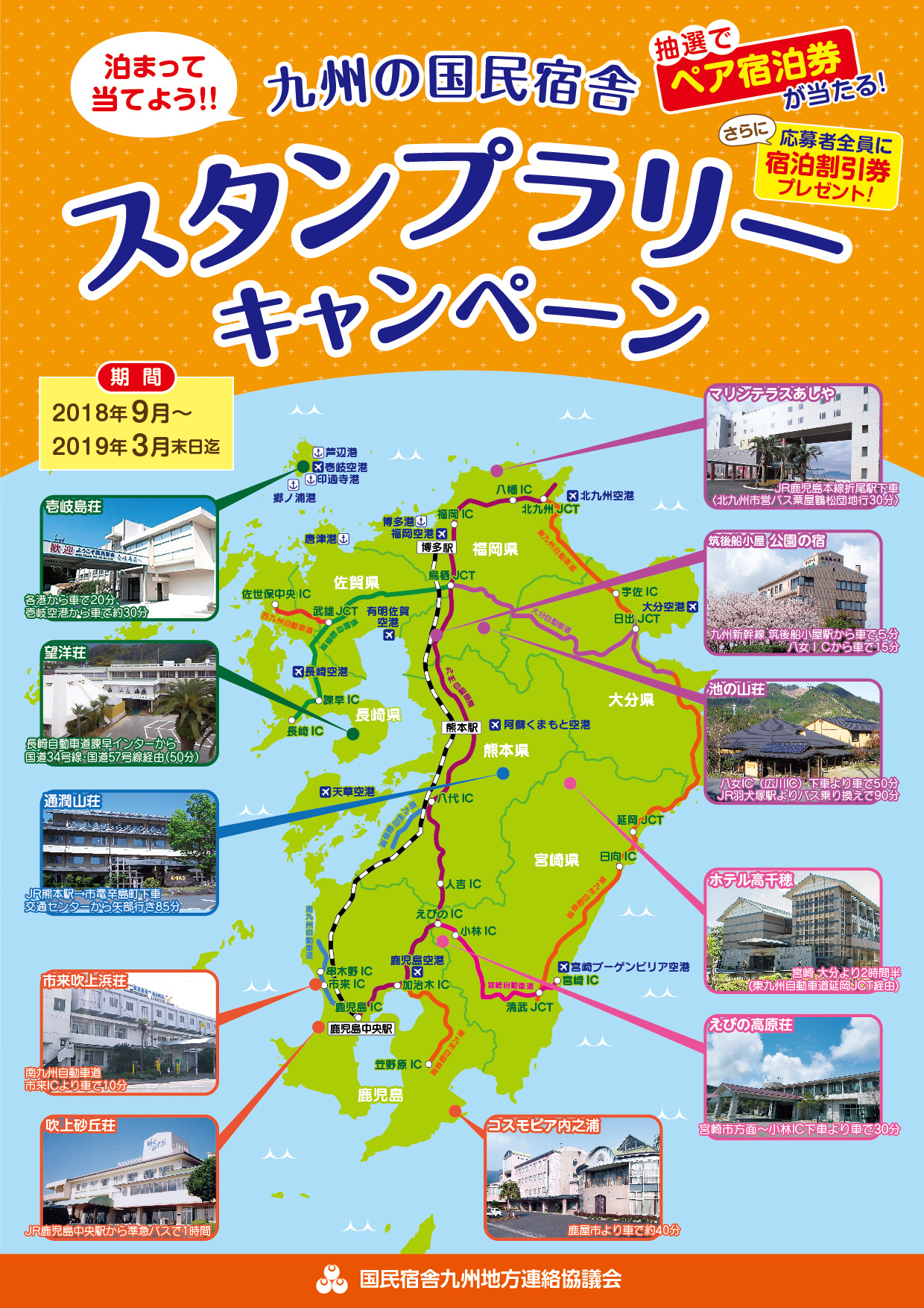 お知らせ詳細 2018.09.03お知らせ 【公営公民宿舎】2018九州スタンプラリーのお知らせ 公共の宿として定評のある公営国民宿舎では2018年9月~2019年3月31日の期間で、九州にある11施設を対象にスタンプラリーを実施します。期間中2つスタンプを集めることで、抽選でペア宿泊券、さらにもれなく10%割引券がもらえます! この機会にぜひ、火の国、九州へ。 ※ペア宿泊券は各宿舎1組ずつのご招待で、計11組に当たります。 ※同じ施設に連泊した場合は宿泊日数分、スタンプが押印されます。また、同じ宿舎に複数回 宿泊された場合でも、宿泊日数分スタンプが押印されます。 詳しくは対象の施設に直接お尋ねください。 お問い合わせ 各宿舎へ リンク先 公営国民宿舎 添付ファイル ダウンロード 2018パンフレット(九州)