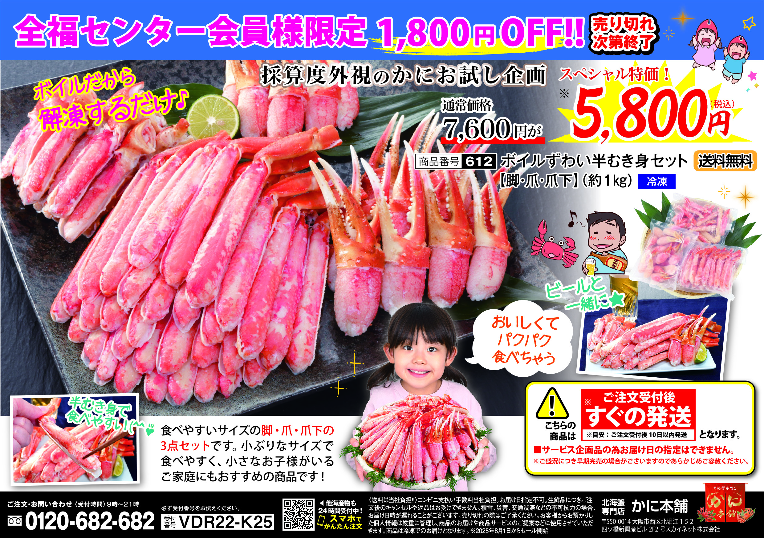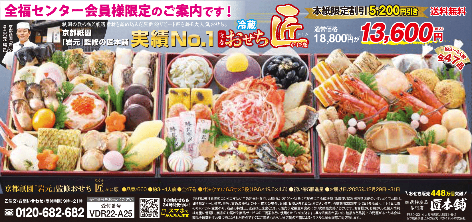 お知らせ詳細 2025.10.01お知らせ 大好評の「匠本舗のお節&海鮮」今年も始まります! 匠本舗は産地直接買い付けを行うなど、お客様の目や舌に代わって 味や品質・価格に徹底してこだわり、お客様のお声を反映して作り上げた 厳選おせちの他に、カニやエビなど海の幸の商品を多数ご用意しております。 お客様満足度94%以上、ネットショップ大賞15年連続1位の商品を どこよりもお安い価格でご提供いたします。 備考 ★商品ラインナップとご購入方法 全福センター会員ログイン後、添付のチラシに記載のTELまたはQRコードからご注文 下さい。チラシの商品は一例で、他にもたくさんの商品を取り揃えており、どの商品 も同じQRコード(またはTEL)からのご注文となります。 なお、お節の納品は12月29日~31日間で、ご指定はできません。 ※全福センター会員ログインID、パスワードがご不明な場合は、ご加入のサービス センター(共済会、互助会等含む)までお尋ねください。 ※画像をクリックすると拡大表示されます