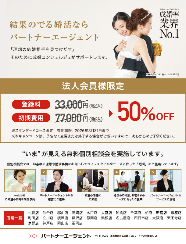 サービス詳細アイコンの説明 全国結婚相談冠婚・葬祭 パートナーエージェント(婚活) 1人ひとりの婚活設計。だから、成婚率 業界No.1。(※) パートナーエージェントは、専任の成婚コンシェルジュが出会いからご成婚まで1人ひとりに合わせた婚活サポートをしていきます。 <パートナーエージェントの特徴> ①独自のメソッド「婚活PDCAサイクル」で、活動を振り返りながらあなたの婚活を最適化 ②成婚コンシェルジュがご紹介~交際~成婚までマンツーマンサポートするので、安心して活動できる ③日本最大級の9.4万人を超える会員ネットワーク「CONNECT-ship」があるから出会いの数が豊富 だからパートナーエージェントは成婚率業界No.1。(※) 最高のサポート品質と、精度が高い出会いで、”結果が出る”婚活をお約束します。 (※)株式会社DRC調べ 2023年2月 基本データ お問い合わせ info@p-a.jp 利用資格 会員のみ ご利用方法 面談時に会員証をご提示ください。 リンク先 パートナーエージェント